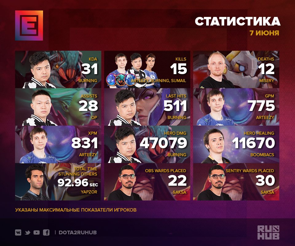 Игрок Invictus Gaming Сю «BurNing» Жилей стал лучшим сразу в четырех показателях: он показал лучший KDA (31) и наивысший урон по героям (47079) на Weaver, а также добил больше всего крипов – 511 на Luna. Кроме того китайский игрок вместе с Сумаилом «SumaiL» Хассаном и Артуром «Arteezy» Бабаевым сделал наибольшее количество убийств – по 15. При этом Arteezy показал максимальные показатели XPM и GPM – 831 и 775, играя на Arc Warden.