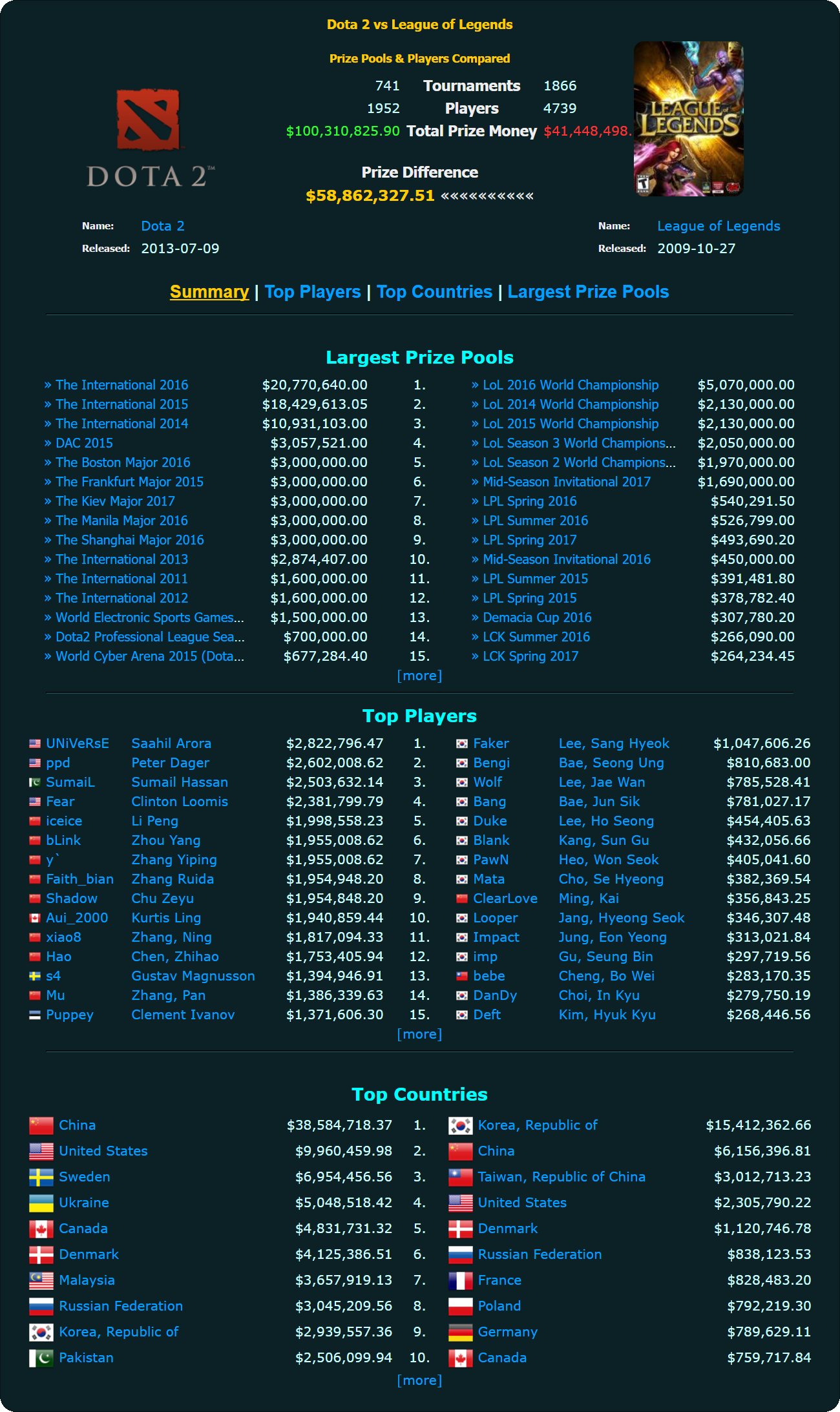 С 2011 года по Dota 2 прошел 741 турнир, в которых участвовали 1952 игрока. За это время сумма призовых составила 100,3 миллионов долларов.