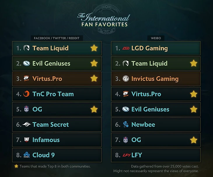 Всего в опросе приняли участие около 25 000 человек. Стоит заметить, что Evil Geniuses, Virtus.pro, OG и Team Liquid попали в топ-8 обоих списков.