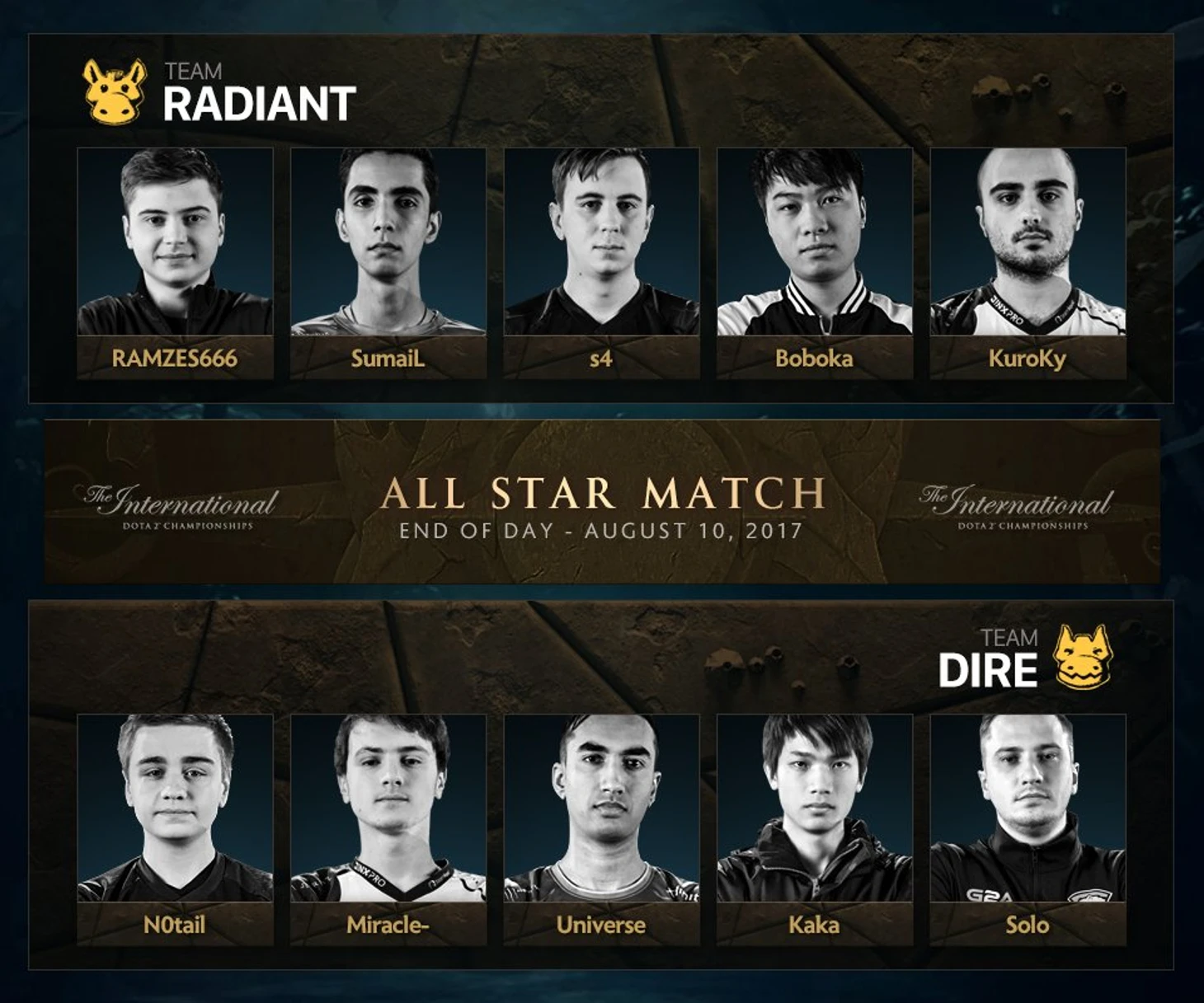 Team Radiant: Роман «RAMZES666» Кушнарев, Сумаил «SuamiL» Хассан, Густав «s4» Магнуссон, Е «BoBoKa» Чжибяо, Куро «KuroKy» Салехи Тахасоми.Team Dire: Йохан «Notail» Сунштайн, Амер «Miracle-» аль-Баркави, Саахил «UNiVeRsE» Арора, Ху «KaKa» Лянчжи, Алексей «Solo» Березин.