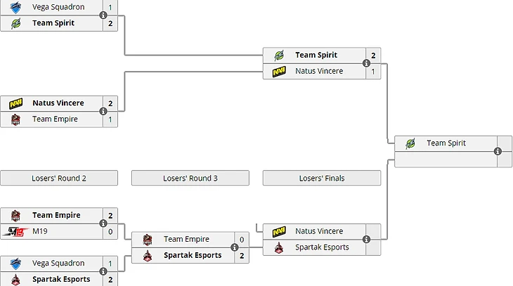 18:00 Vega Squadron 1:2 Team Spirit21:30 Natus Vincere 2:1 Team Empire