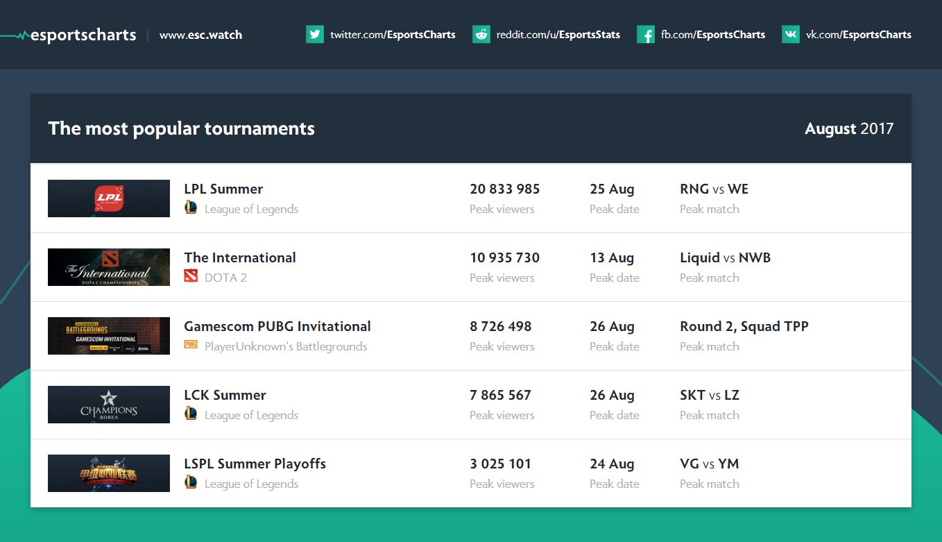 С учетом зрителей из Китая самым популярным стал матч между RNG и WE на LPL Summer – пиковый показатель составил 20,8 миллиона зрителей. Финал The International между Team Liquid и NewBee одновременно смотрели 10,9 млн человек, а 2-й раунд турнира по PUBG достиг пикового показателя в 8,7 миллиона зрителей.