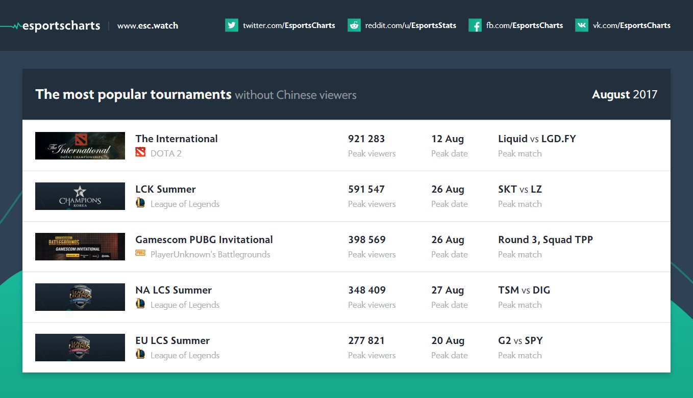 Без учета китайской аудитории самым популярным событием стал финал нижней сетки TI7 между Team Liquid и LGD.FY – его смотрели 921 283 зрителя. На втором месте – игра между SKT и LZ в рамках LCK Summer, которую на пике смотрели 591 547 зрителей. На третьем месте по популярности оказался 3-й раунд турнира по PUBG на Gamescom с пиковым показателем 398 569 зрителей.