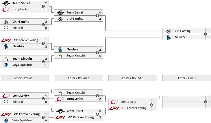 5:00 Team Secret 2:1 Complexity9:00 Mineski 0:2 Vici Gaming13:00 Team Secret 0:2 Vici Gaming / Матч за выход в финал верхней сетки