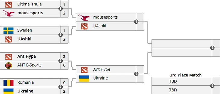 12:00 Mousesports 2:1 UAshki15:00 AntiHype 2:0 Ukraine18:00 Mousesports 0:2 AntiHype / Финал21:00 UAshki 0:2 Team Ukraine / Матч за 3-е место