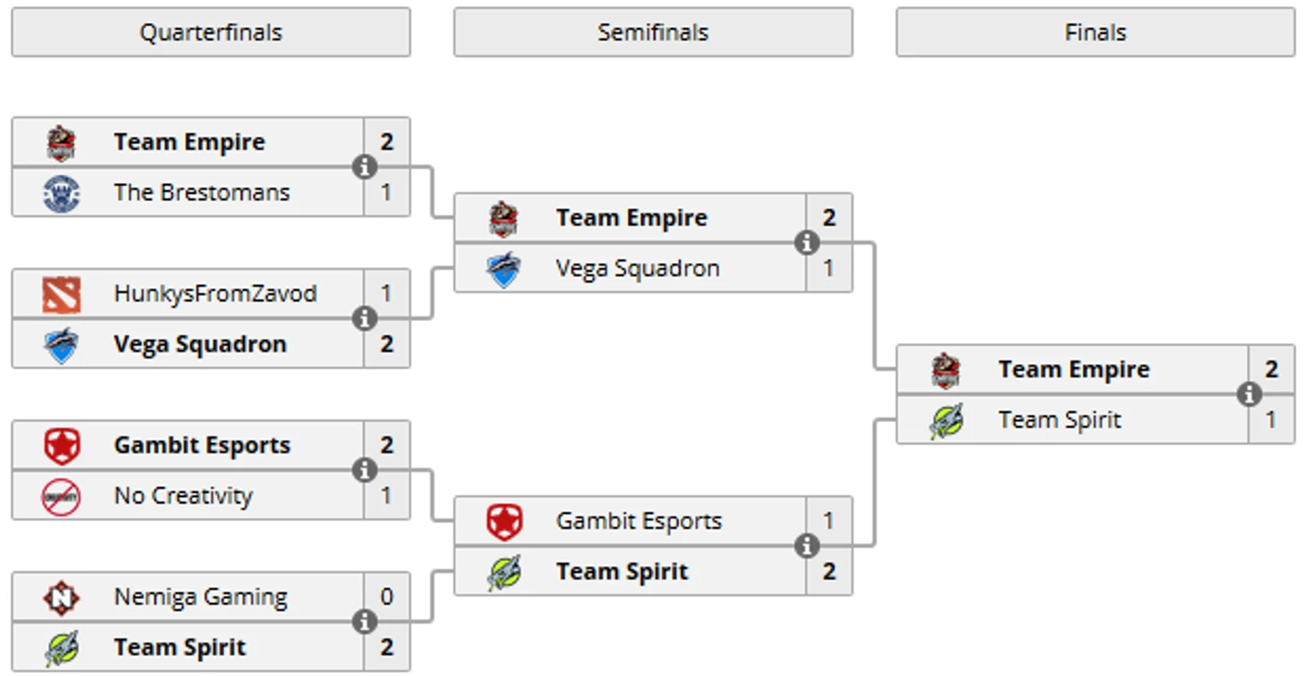 Формат квалификации – Single Elimination, формат матчей – Во3. Gambit Esports в четвертьфинале сыграет с No Creativity, Team Spirit – с Nemiga Gaming.
