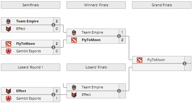 16:00 Effect 1:2 Team Empire / финал нижней сетки19:00 FlytoMoon 1:3 Team Empire / гранд-финал