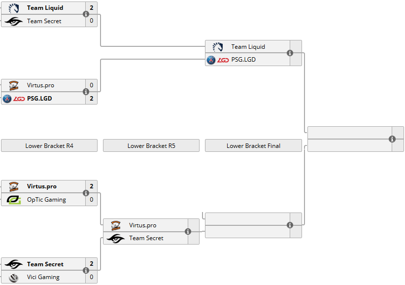 5:00 Virtus.pro 2:0 Optic Gaming / Четвертый раунд нижней сетки8:00 Team Secret 2:0 Vici Gaming / Четвертый раунд нижней сетки11:00 Virtus.pro 2:1 Team Secret / Пятый раунд нижней сетки14:00 Team Liquid 2:0 PSG.LGD / Финал верхней сетки