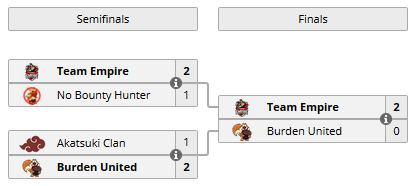 15:00 Team Empire 2:1 No Bounty Hunter18:00 Akatsuki Clan 1:2 Burden United21:00 Team Empire 2:0 Burden United / Финал