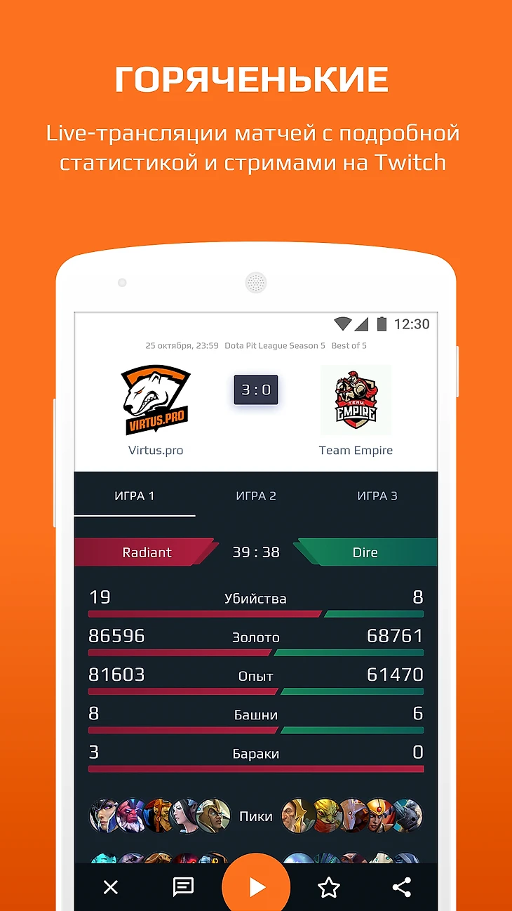 – Расписание матчей.– Пуши о начале и результате любимых команд и матчей, на которые вы подписались.– Пики и баны каждой игры.– Стримы главных игр (русский и англоязычный).– Подробная статистика игры и отдельных героев.– Лента главных новостей, текстов и хайлайтов.– Можно подписываться на стримы любимых игроков и получать уведомления о начале стрима.