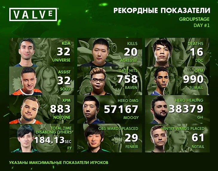 Капитан Virtus.pro Алексей «Solo» Березин совершил больше всех ассистов в одном матче – 32. Мидер СНГ-состава Владимир «No[o]ne» Миненко показал лучший результат по скорости прокачки своего персонажа. Он получал 883 XP в минуту.
