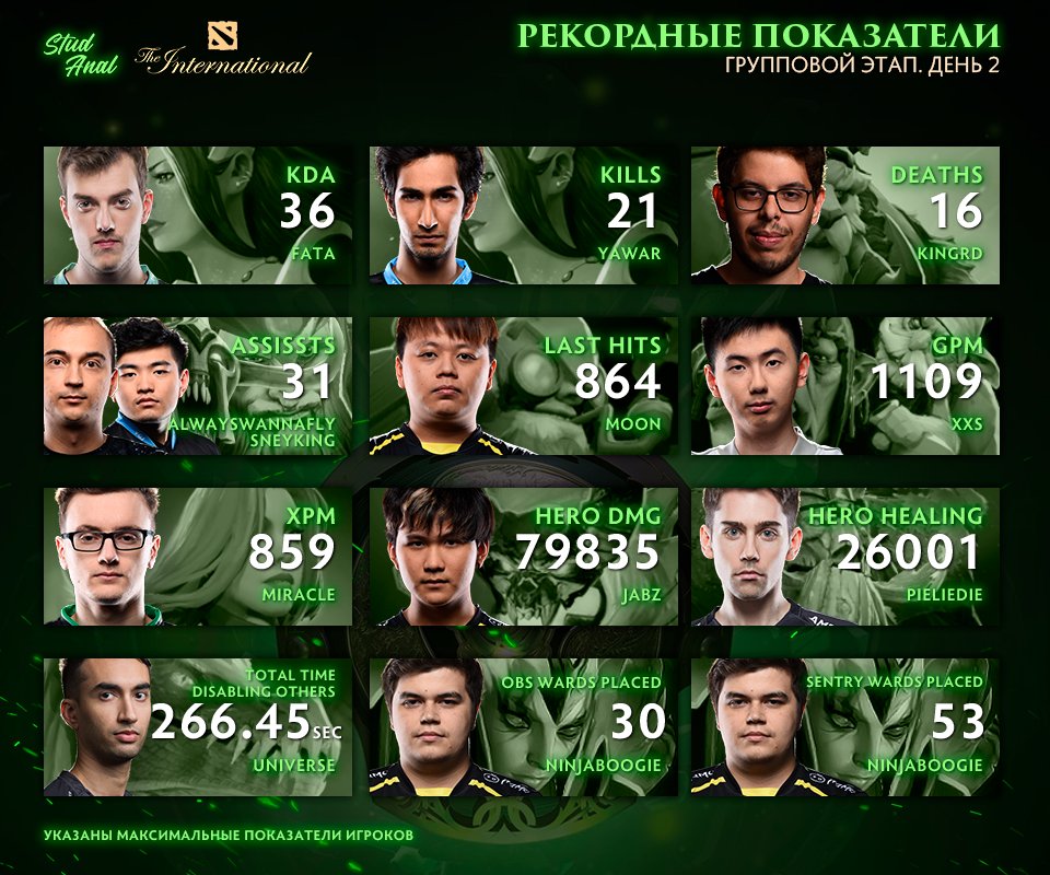 Администратор RuHub Олег «statsByLeo» Повар составил инфографику, в которой показал лучших игроков второго дня The International 2018 по определенным показателям.
