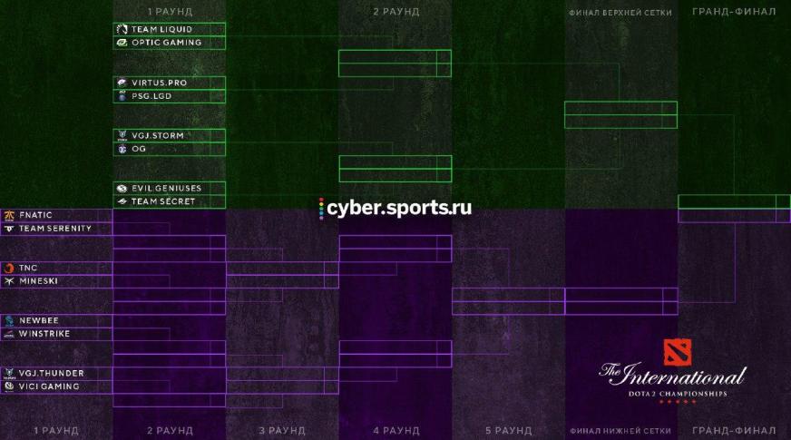 Virtus.pro предстоит сыграть в верхней сетке с PSG.LGD, занявшей третье место в группе А. VGJ.Storm, лидирующая в группе В выбрала себе в соперники OG. Team Liquid предстоит сразиться с Optic Gaming, а Evil Geniuses – c Team Secret.