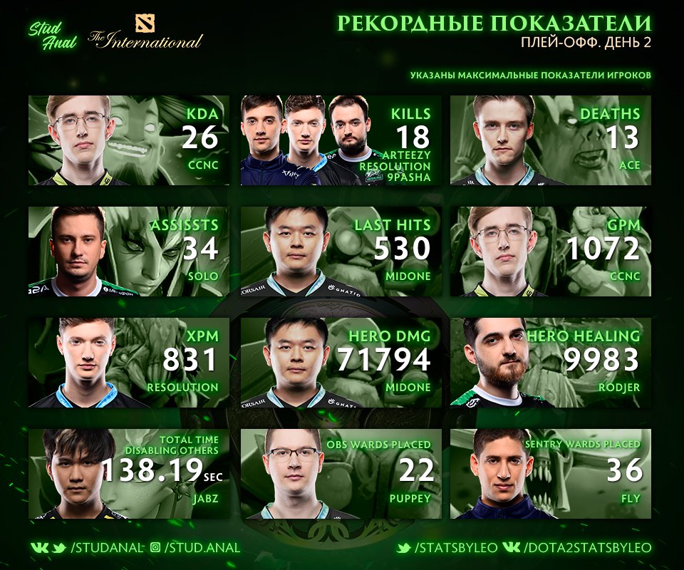 Игрок Optic Gaming Квин «CCnC» Каллахан показал лучший KDA в отдельно взятом матче. Его статистика по убийствам/смертям/ассистам составила 26. Сразу трем игрокам удалось получить одинаковое количество фрагов за игру. Роман «Resolut1on» Фоминок, Павел «9pasha» Хвастунов и Артур «Arteezy» Бабаев сделали по 18 убийств за одну карту.