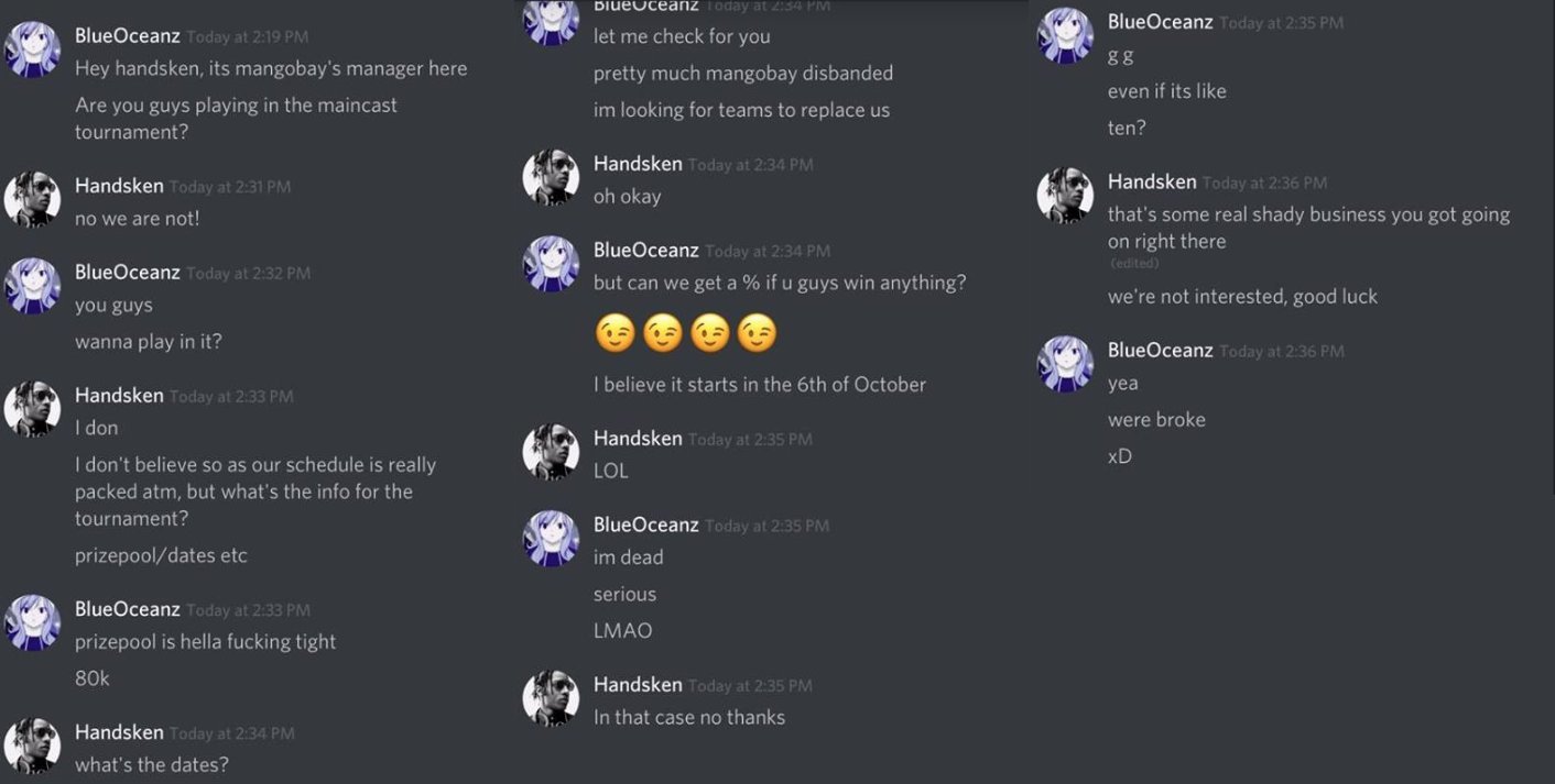 Мидер The Final Tribe Расмус «Chessie» Бломдин опубликовал переписку Саймона «Handsken» Хаага и менеджера Mangobay Николаса «BlueOceanz» Блю.