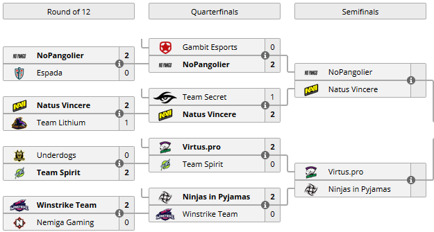 18:00 No Pangolier 2:1 Natus Vincere / Полуфинал21:00 NiP 1:2 Virtus.pro / Полуфинал