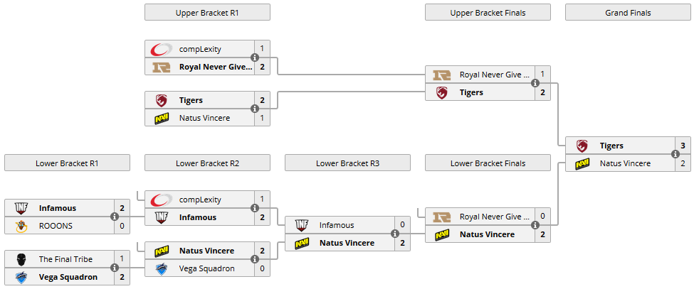 15:30 Natus Vincere 2:0 Royal Never Give Up / Финал нижней сетки18:30 Tigers 3:2 Natus Vincere / Гранд-финал