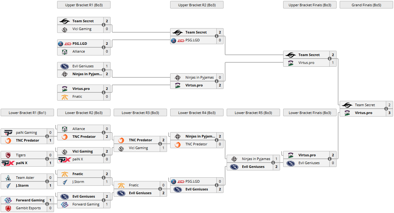 6:00 Evil Geniuses 0:2 Virtus.pro / Финал нижней сетки11:00 Team Secret 2:3 Virtus.pro / Гранд-финал