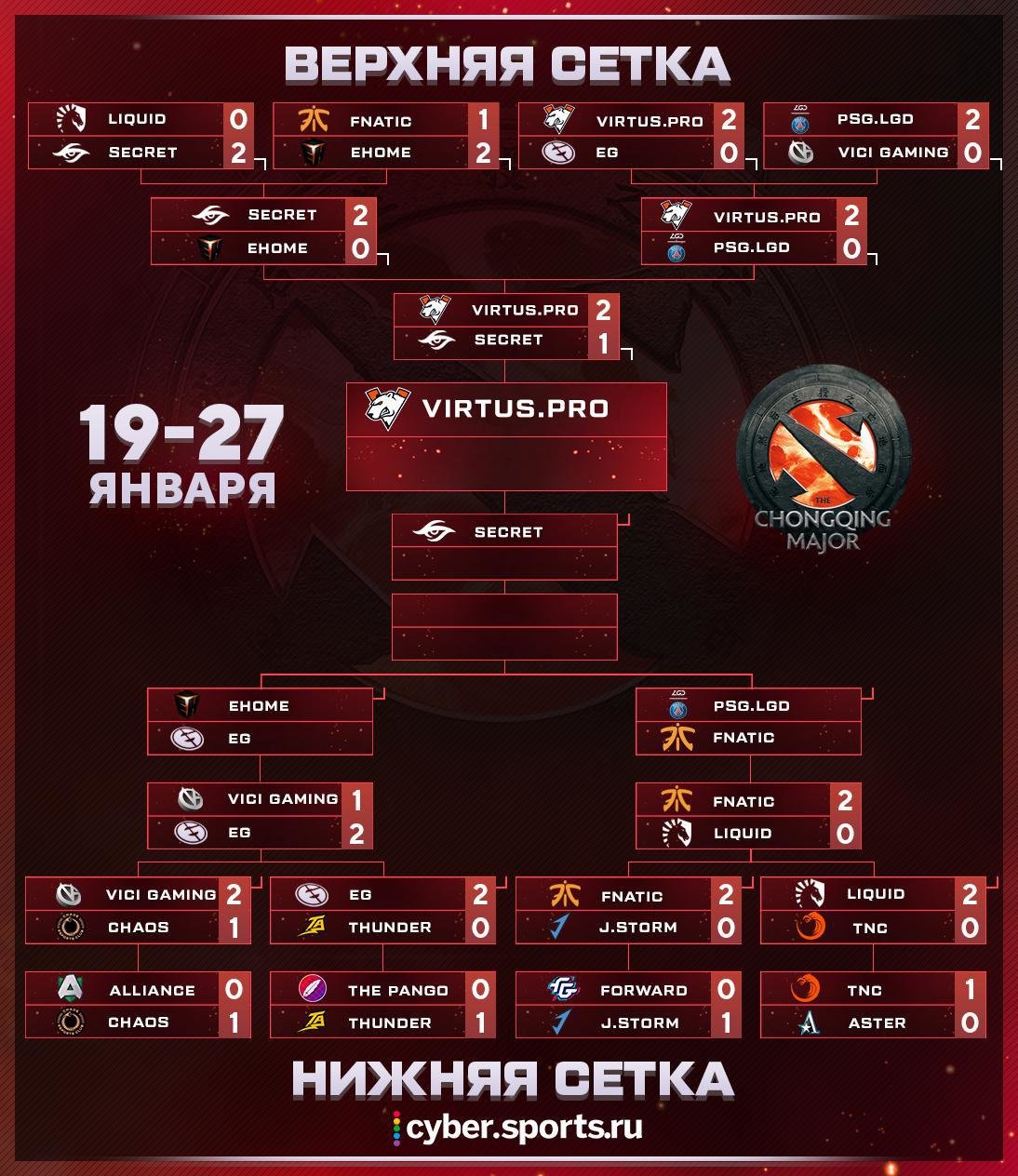 Virtus.pro победила Team Secret со счетом 2:1 в финале верхней сетки мейджора по Dota 2 в Чунцине.