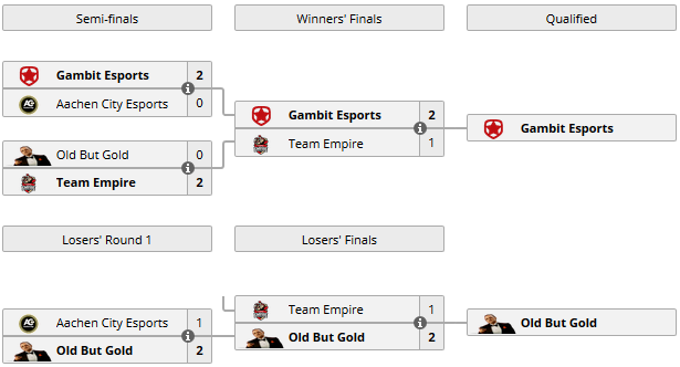 15:00 Gambit 2:0 Aachen City Esports / Полуфинал верхней сетки15:00 Old But Gold 0:2 Team Empire / Полуфинал верхней сетки18:00 Gambit 2:1 Team Empire / Финал верхней сетки18:00 Aachen City Esports 1:2 Old But Gold / 1-й раунд нижней сетки21:00 Old But Gold 2:1 Team Empire / 2-й раунд нижней сетки