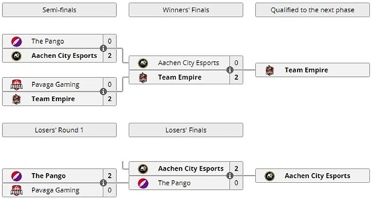 15:00 The Pango 0:2 Aachen City Esports15:00 Pavaga Gaming 0:2 Team Empire18:00 Aachen City Esports 0:2 Team Empire / Финал верхней сетки18:00 The Pango 2:0 Pavaga Gaming / 1-й раунд нижней сетки21:00 Aachen City Esports 2:0 The Pango / 2-й раунд нижней сетки