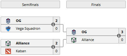 15:00 OG 1:1 Kaban15:00 Vega Squadron 0:2 Alliance17:00 OG 2:0 Dota 2 Players17:00 Vega Squadron 2:0 The Real Deal19:00 Kaban 2:0 Dota 2 Players19:00 Alliance 2:0 The Real Deal20:15 OG 1:0 Kaban / Переигровка