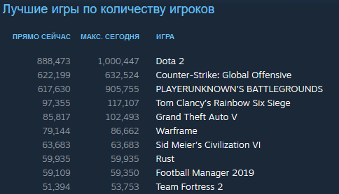 Dota 2 занимает первое место по онлайну в Steam.