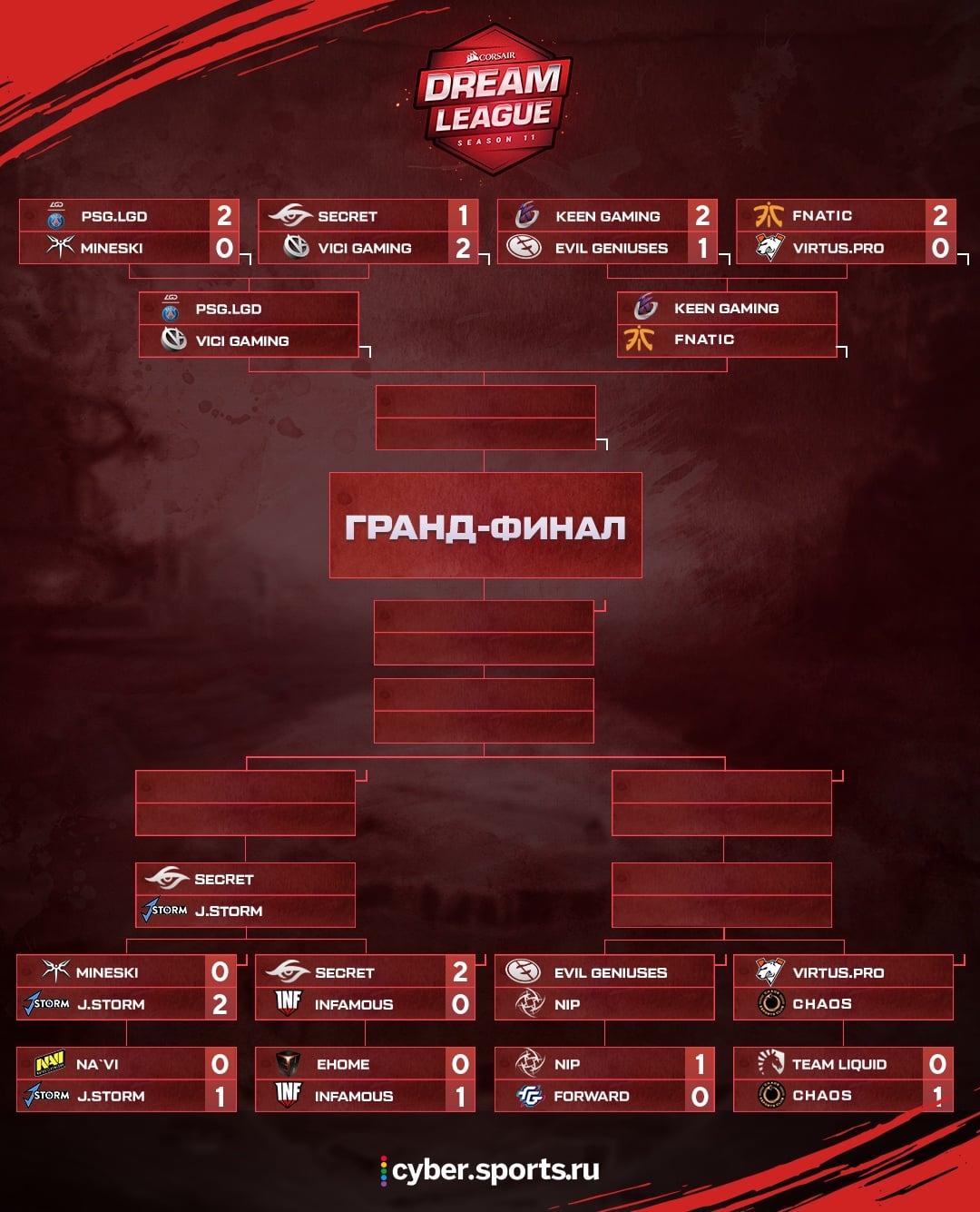 15:30 Mineski 0:2 J.Storm / 2-й раунд нижней сетки18:30 Team Secret 2:0 Infamous / 2-й раунд нижней сетки