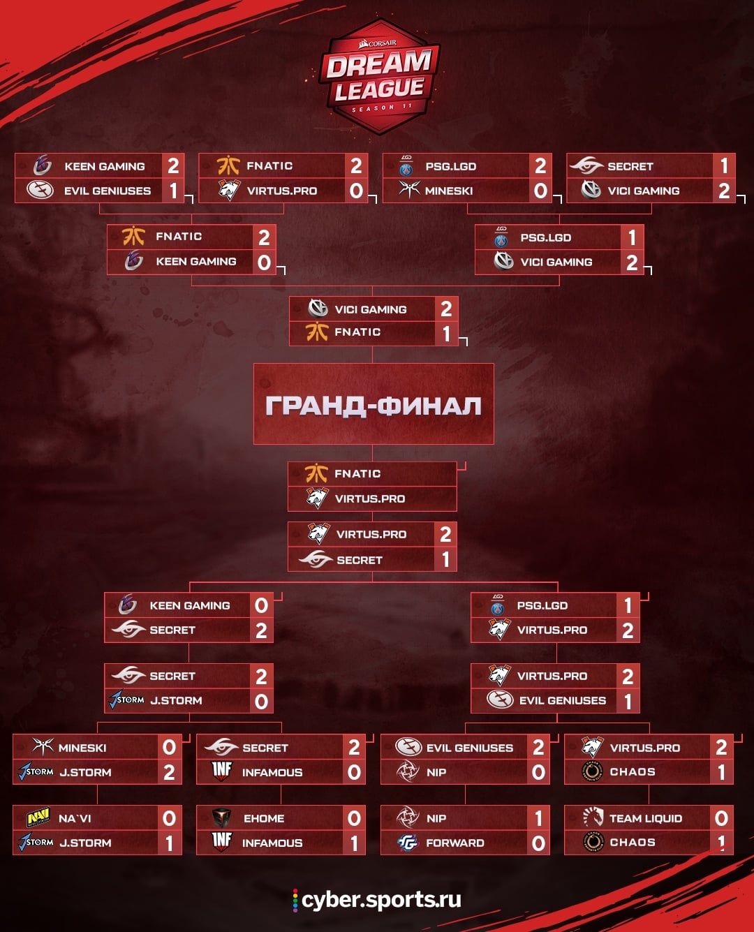 12:30 Virtus.pro 2:1 PSG.LGD15:30 Team Secret 2:0 Keen Gaming18:30 Team Secret 1:2 Virtus.pro21:30 Vici Gaming 2:1 Fnatic