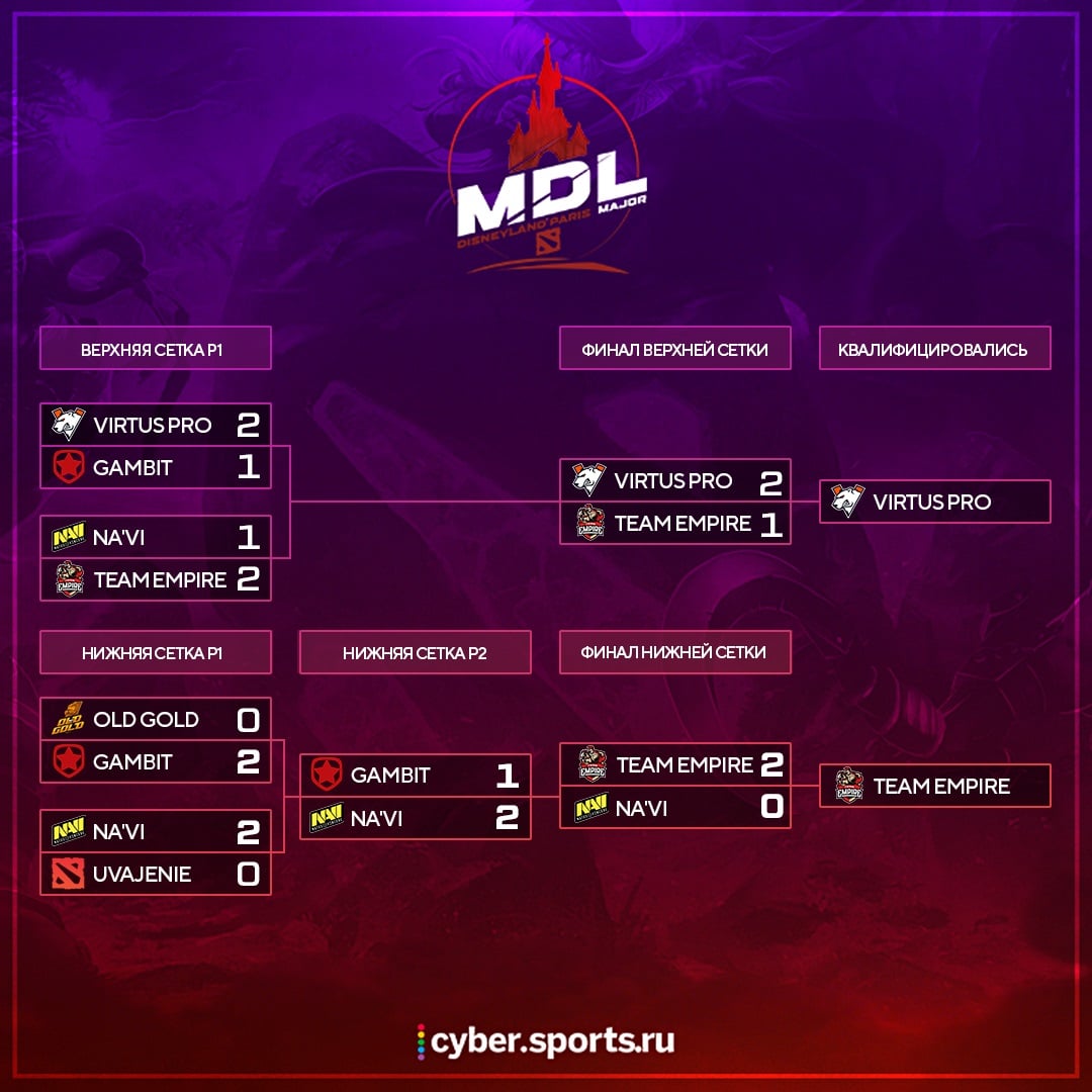 13:00 Virtus.pro 2:1 Team Empire / 2-й раунд верхней сетки16:30 Na`Vi 2:1 Gambit / 2-й раунд нижней сетки20:00 Team Empire 2:0 Na`Vi / 3-й раунд нижней сетки
