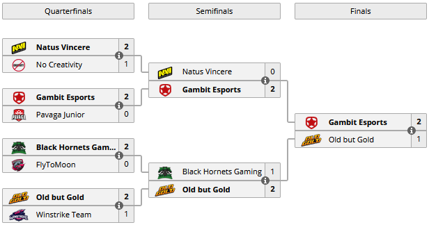 17:00 Na`Vi 2-1 No Creativity / Четвертьфинал19:00 Gambit 2-0 Pavaga Junior / Четвертьфинал21:00 Black Hornets 2-0 FlyToMoon / Четвертьфинал23:00 Old but Gold 2-1 Winstrike / Четвертьфинал