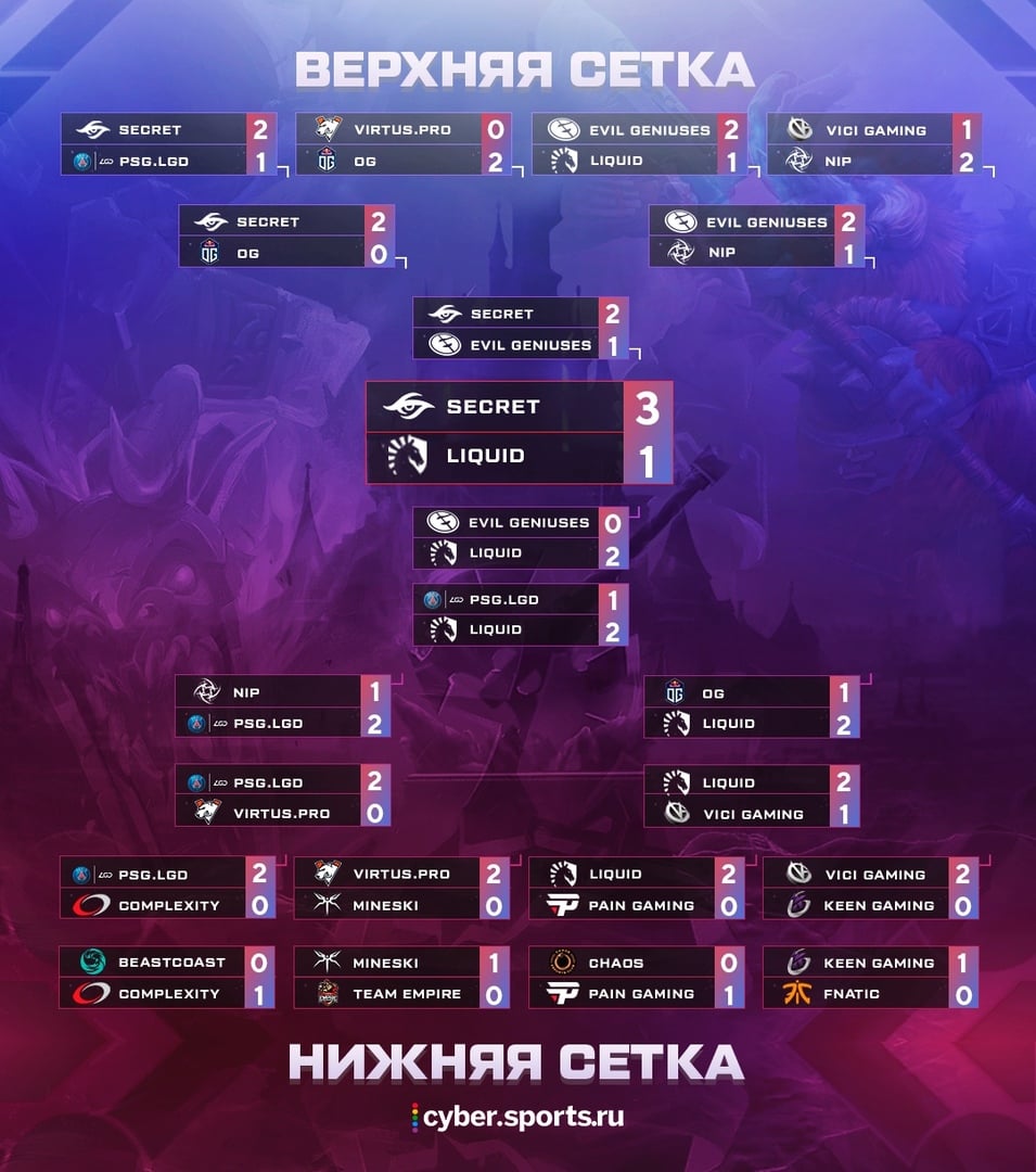 14:00 Team Liquid 2:0 Evil Geniuses / финал нижней сетки18:00 Team Secret 3:1 Team Liquid / гранд-финал