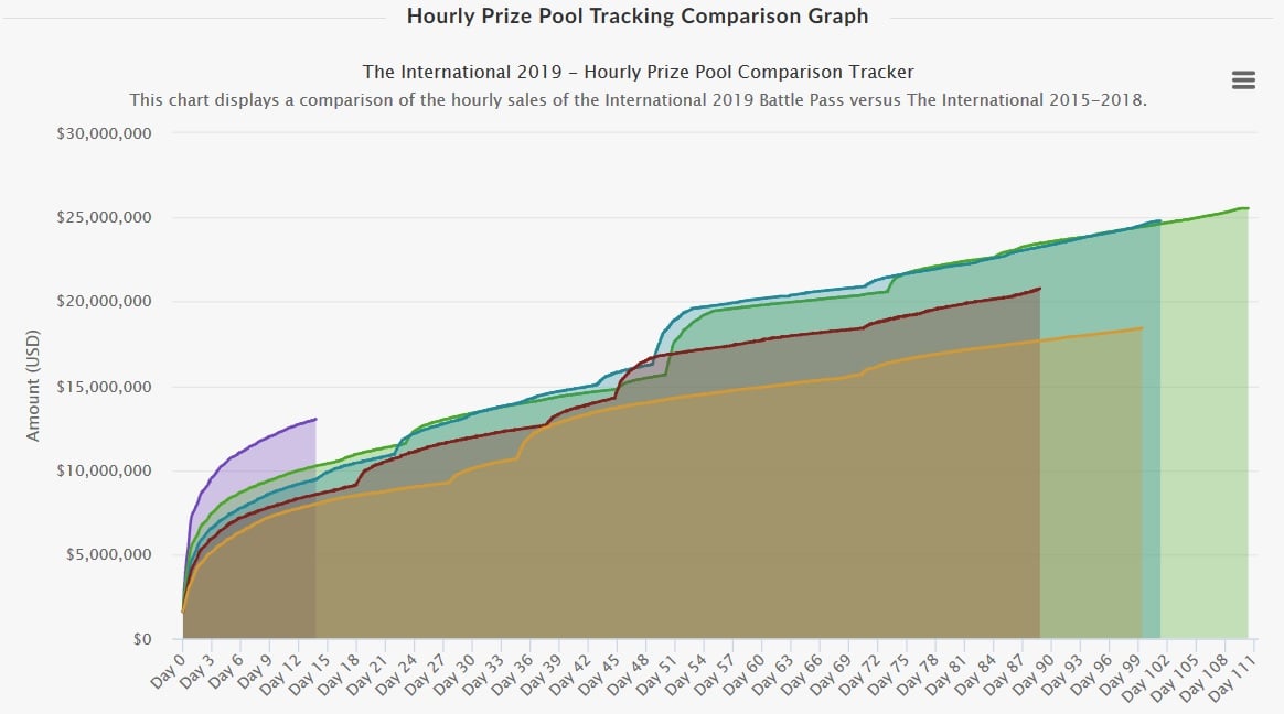 В 2018 году для достижения этой отметки понадобилось 27 дней и 4 часа, а на тринадцатом дне после выхода Battle Pass призовой фонд The International 2018 составлял 10 млн.