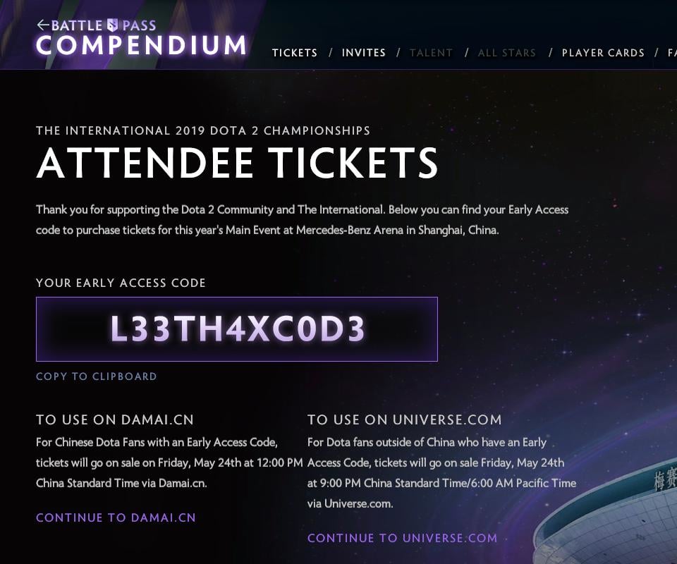 С этим кодом можно приобрести билеты на час раньше, чем они поступят в продажу. Код доступен только для тех владельцев Battle Pass или Dota Plus, которые приобрели их раньше 21 мая.