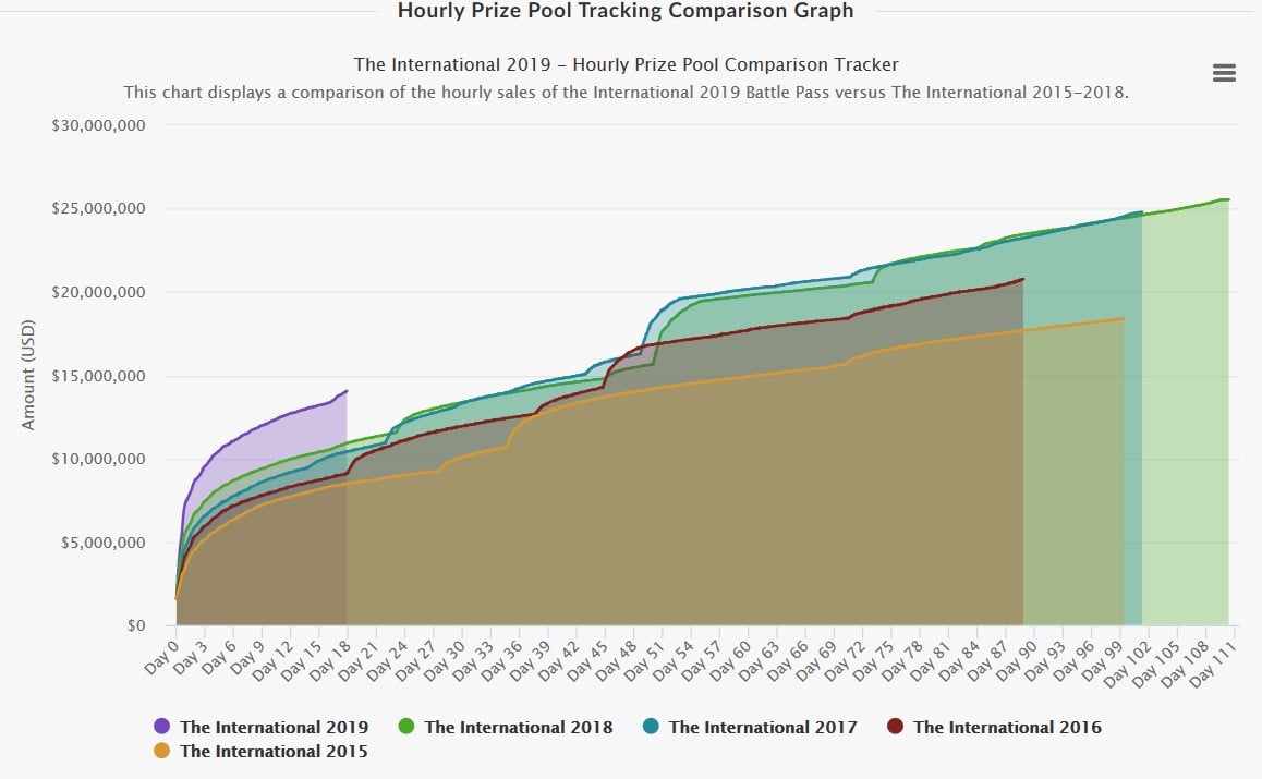 В 2018 году для достижения этой отметки потребовалось 35 дней и 18 часов. На семнадцатом дне после выхода Боевого пропуска призовой фонд составлял 10,9 млн долларов.