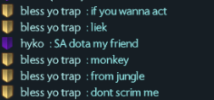 «Если ты собираешься вести себя как обезьяна, не скримься со мной», – написал bless yo trap во время скрима.