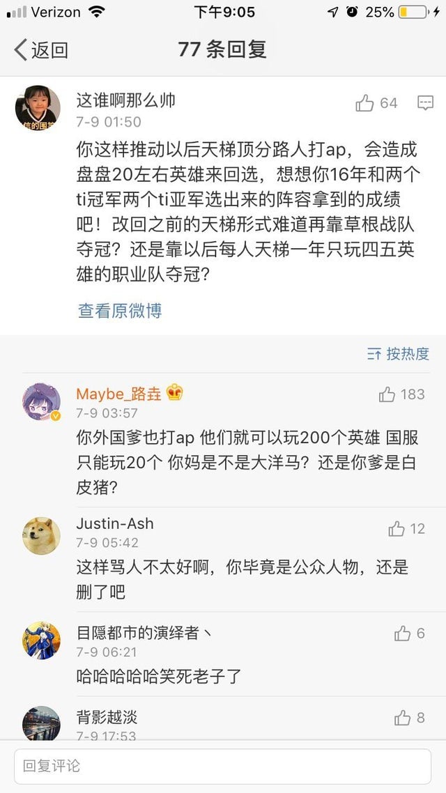До этого на Weibo обсуждали режимы игры, и Somnus丶M говорил, что стоит играть All Pick, а не Random Draft, который очень популярен в Китае. Над ним подшутили из-за его небольшого пула героев.