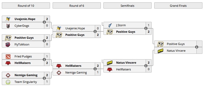 14:00 Fried Pudges 1:2 HellRaisers17:00 Positive Guys 2:0 FlyToMoon