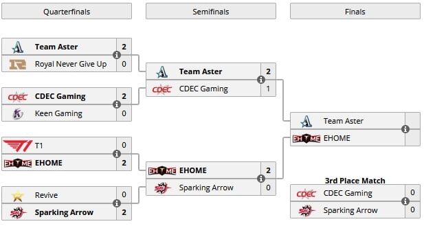 Четвертьфинал 5:00 Team Aster 2:0 Royal Never Give Up7:30 CDEC 2:0 Keen Gaming11:30 T1 0:2 Ehome 14:00 Revive 0:2 Sparking Arrow