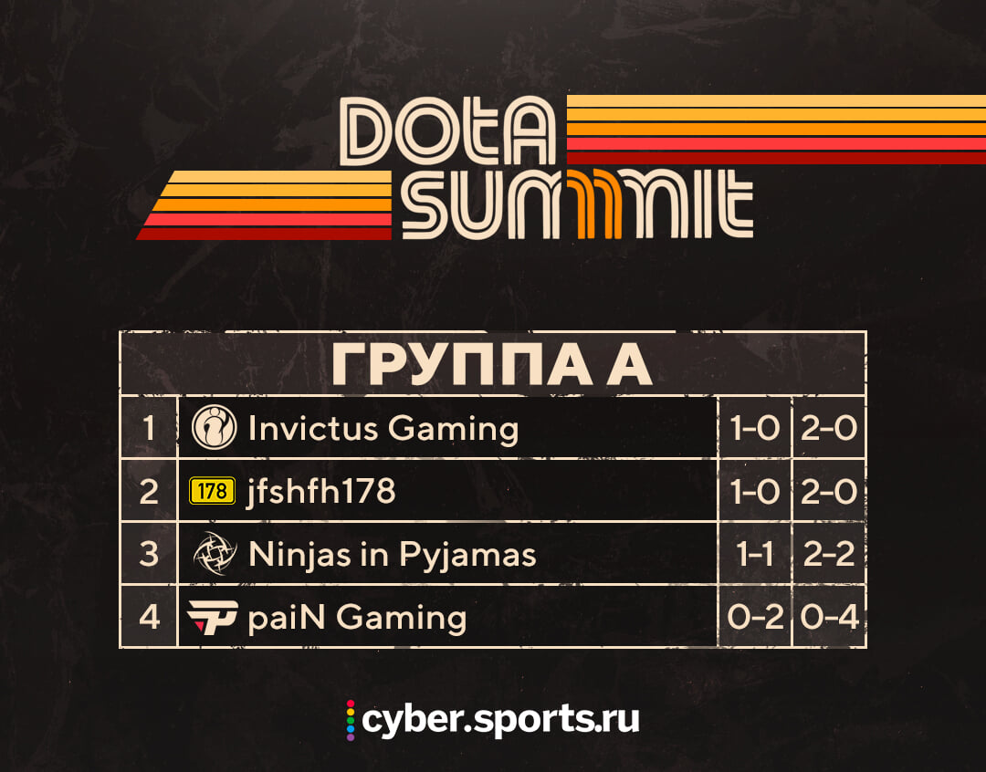 20:00 Ninjas in Pyjamas 0:2 jfshfh178 / первый раунд группы A20:00 Invictus Gaming 2:0 Pain Gaming / первый раунд группы A23:00 Chaos 2:0 HellRaisers / первый раунд группы B23:00 Ad Finem 0:2 Geek Fam / первый раунд группы B