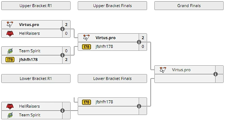 14:00 Virtus.pro 2:0 HellRaisers17:00 Team Spirit 0:2 jfshfh17819:00 Virtus.pro 2:0 jfshfh178 / финал верхней сетки