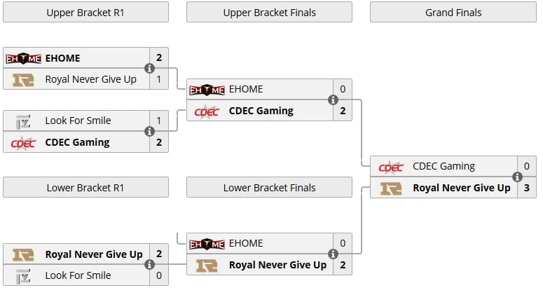 6 декабря 8:00 Ehome 0:2 Royal Never Give Up / финал нижней сетки11:30 CDEC 0:3 Royal Never Give Up / гранд-финал