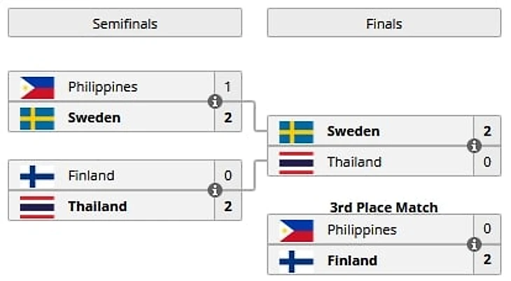 9:30 Швеция 2:1 Филиппины9:30 Таиланд 2:0 Финляндия13:00 Филиппины 0:2 Финляндия / матч за третье место