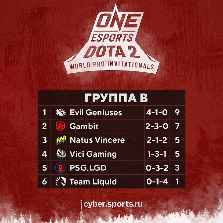 7:30 Team Liquid 1:1 PSG.LGD7:30 Vici Gaming 1:1 Gambit7:30 Evil Geniuses 2:0 NAVI