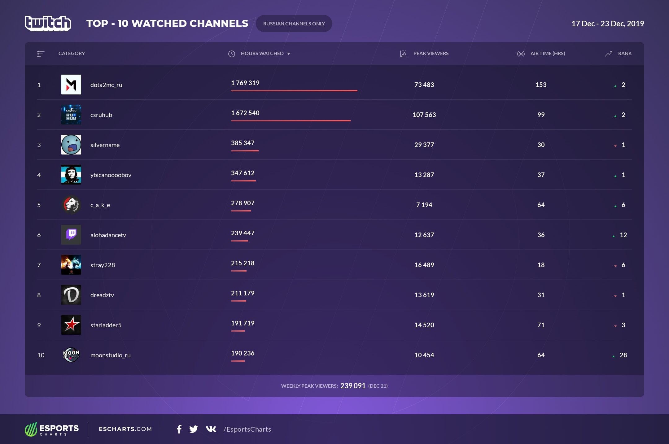 Esports Charts представил статистику русскоязычных стримов на Twitch за прошедшую неделю (с 17 по 23 декабря).