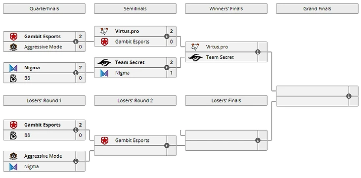 Команда Клемента «Puppey» Иванова вышла в финал верхней сетки, где ей предстоит встреча с Virtus.pro. Nigma упала в нижнюю сетку, где сыграет против команды Лила в матче на вылет с турнира.