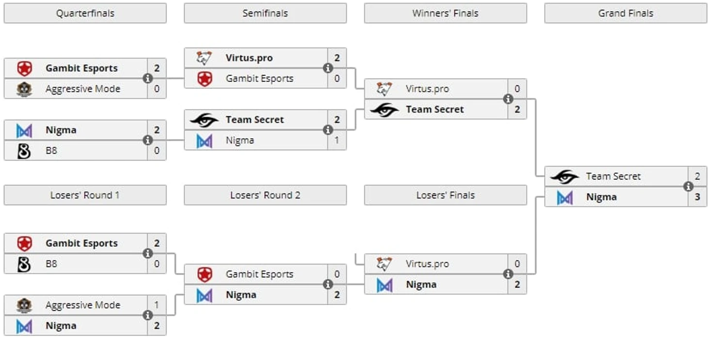В гранд-финале Nigma обыграла Secret со счетом 3:2 и заработала 130 тысяч долларов. Выигрыш Secret – 60 тысяч.