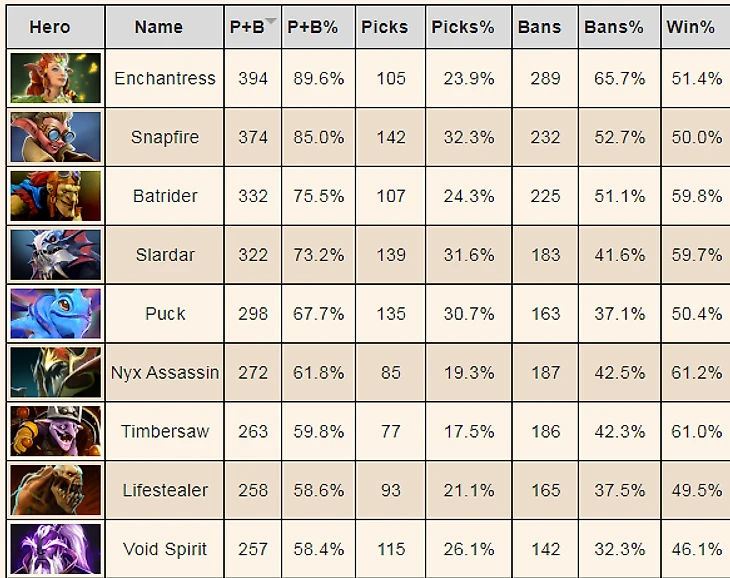Чаще всего пикалась и банилась Enchantress – 394 раза. Snapfire идет следом за ней (374 раза), а Void Spirit, который попадал в пики и баны 257 раз, занимает 9-е место.
