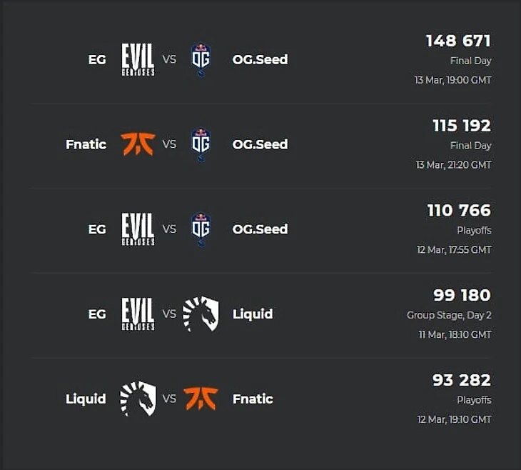 Самым популярным матчем американского лана стал финал нижней сетки между Evil Geniuses и OG Seed. За ним на пике следили почти 150 тысяч зрителей.