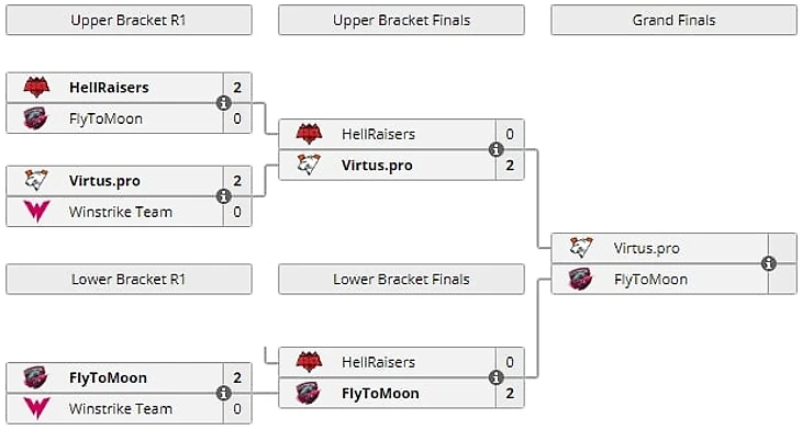 15:00 FlyToMoon 2:0 Winstrike / первый раунд нижней сетки плей-офф18:00 HellRaisers 0:2 FlyToMoon / финал нижней сетки плей-офф